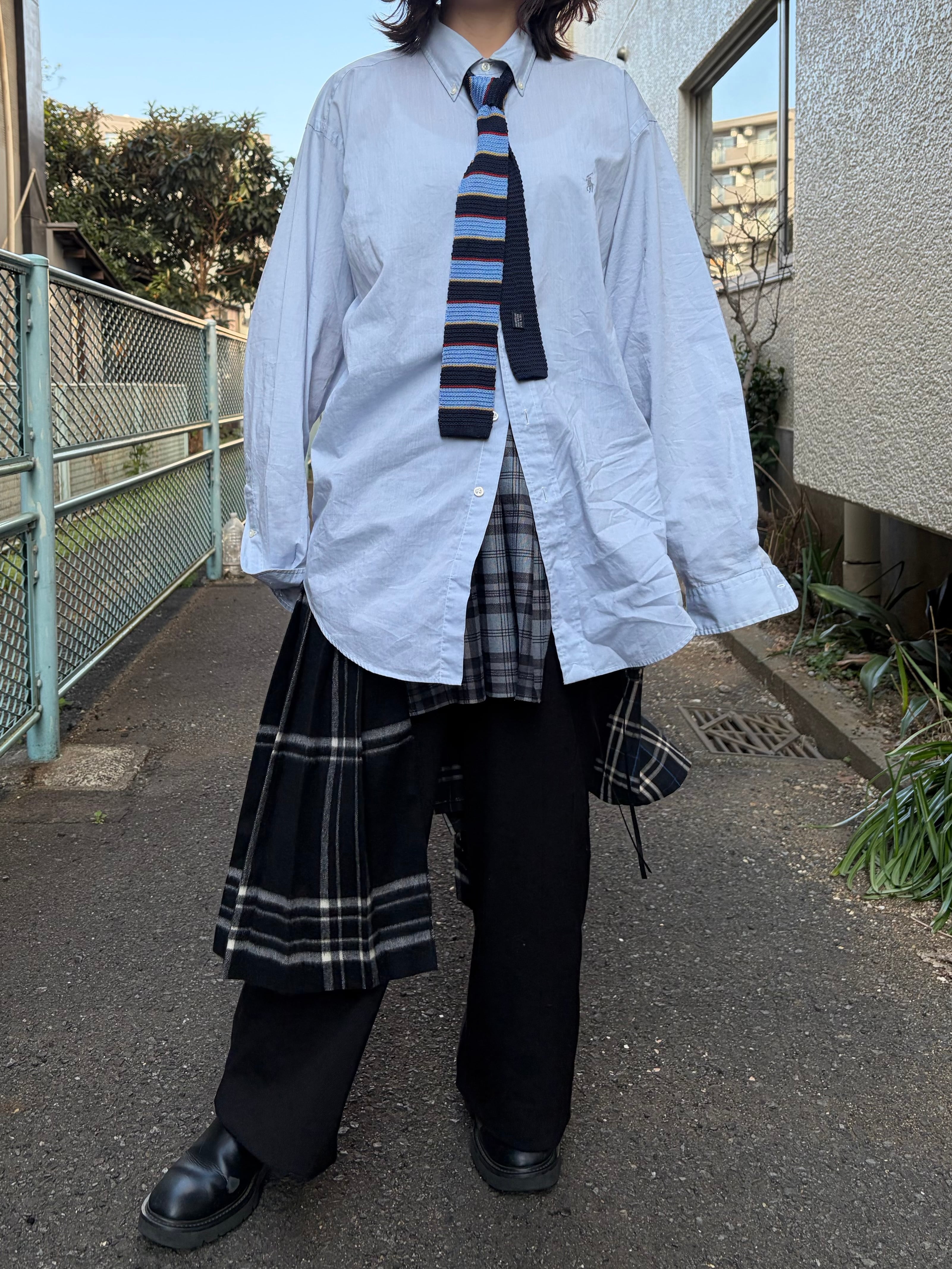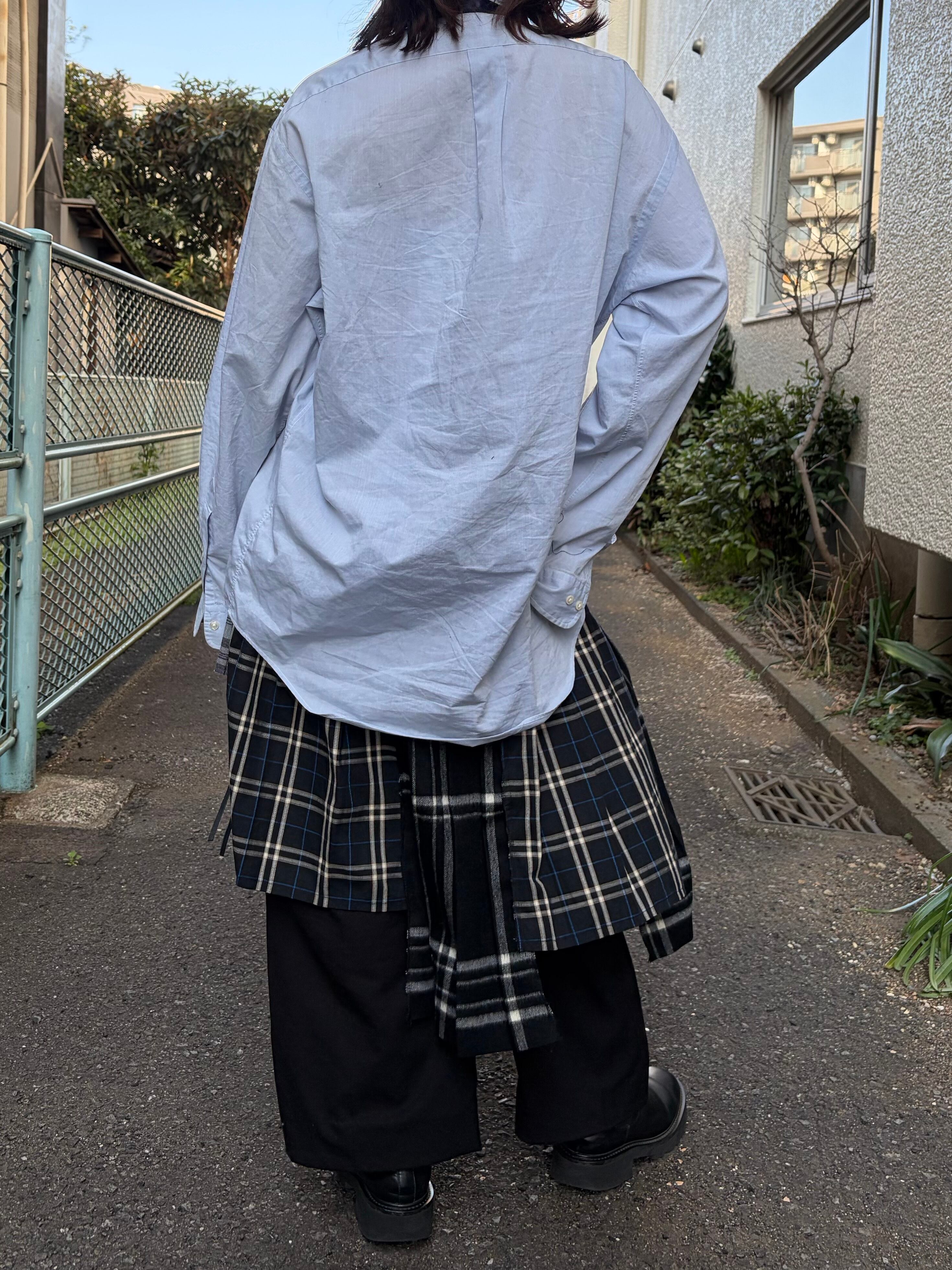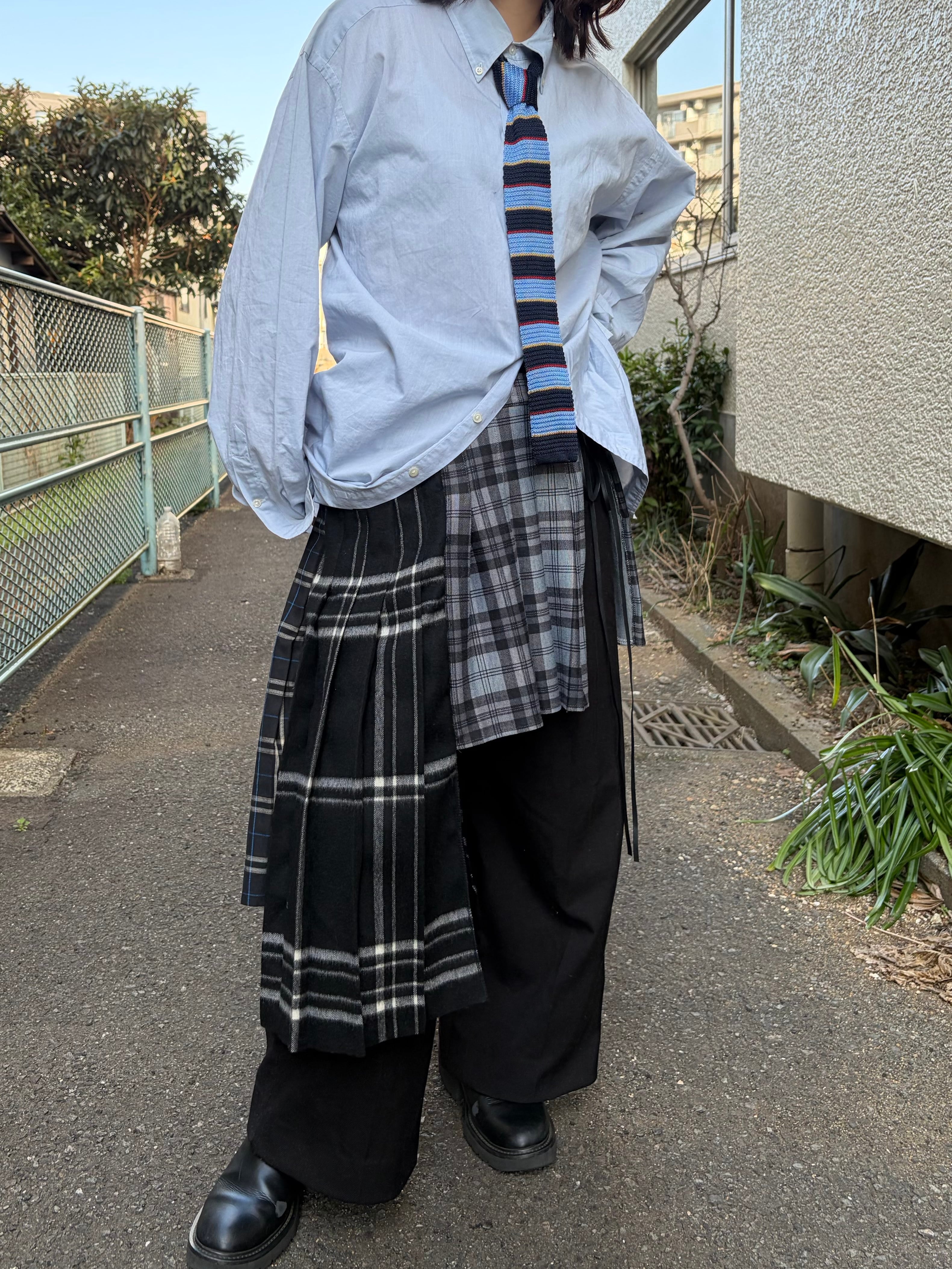 異なるチェック生地を組み合わせて構成したラップスカート。
