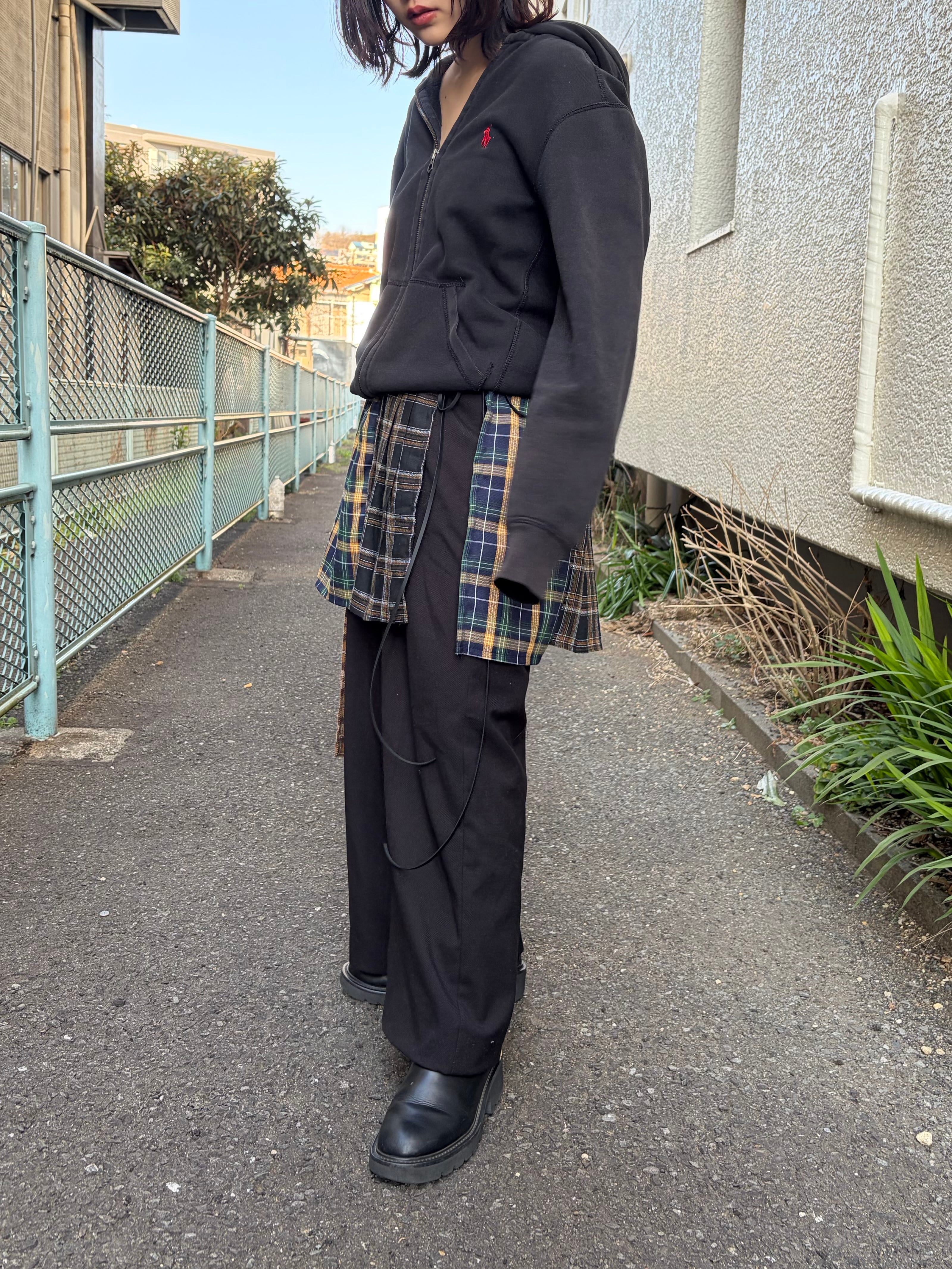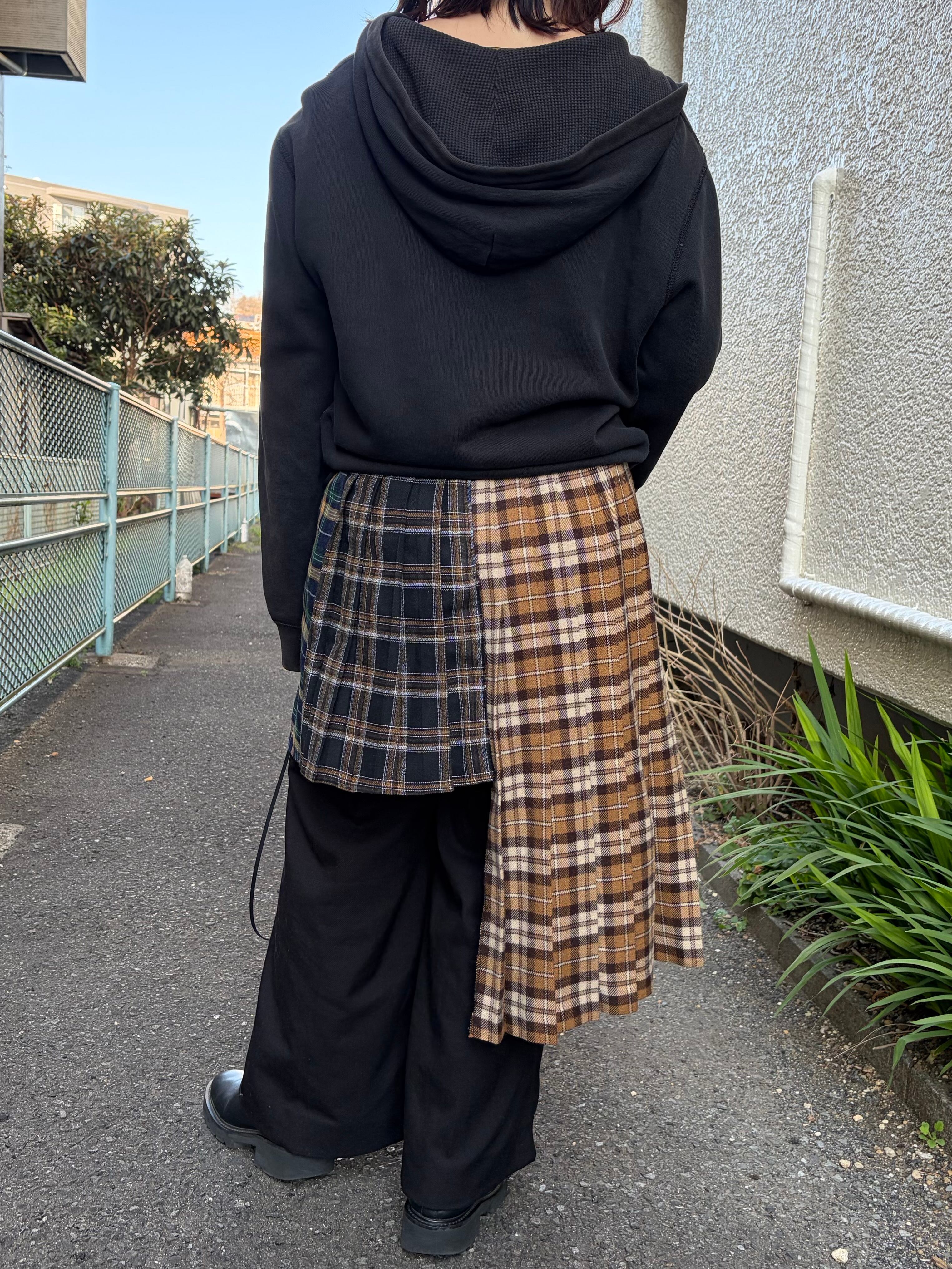 異なるチェック生地を組み合わせて構成したラップスカート。