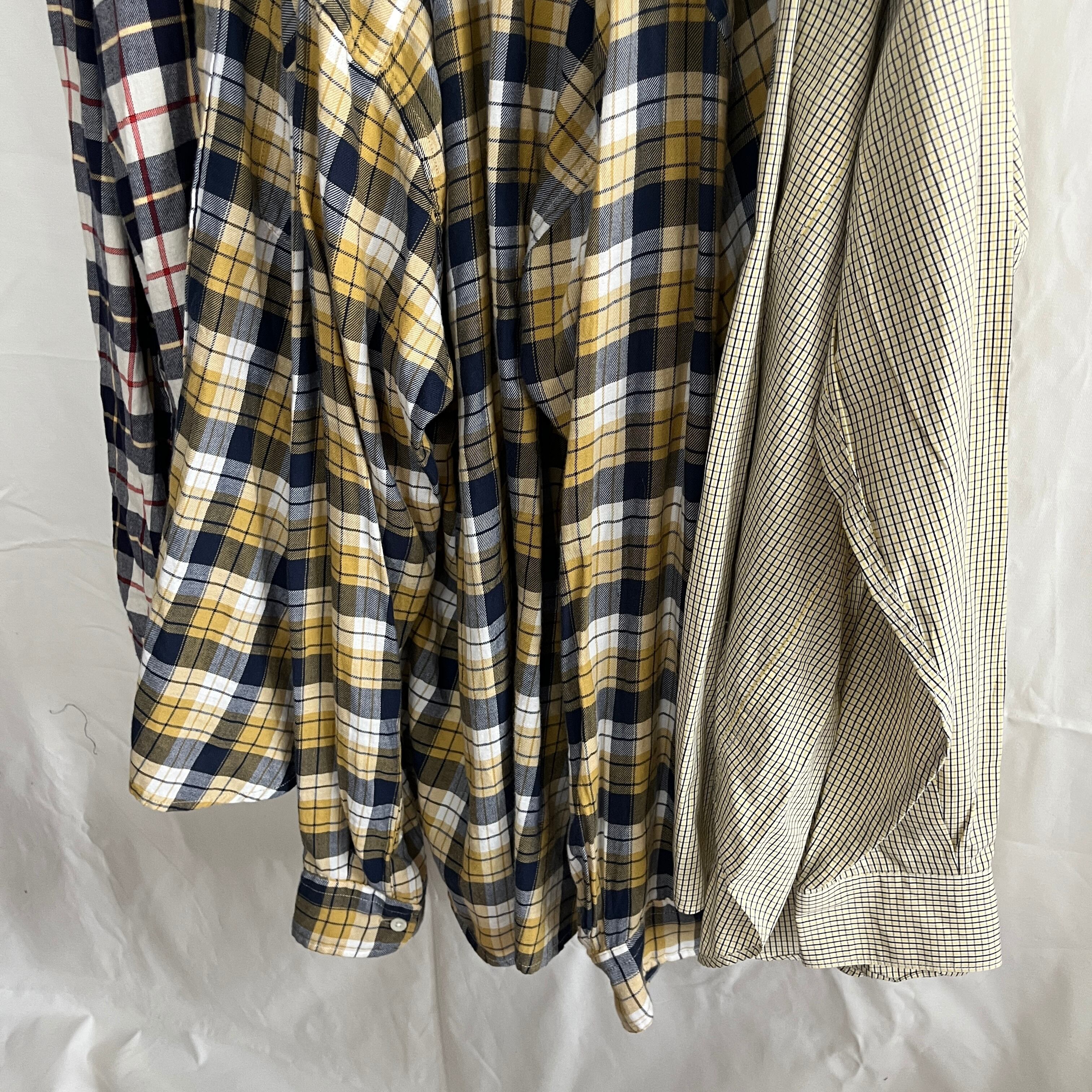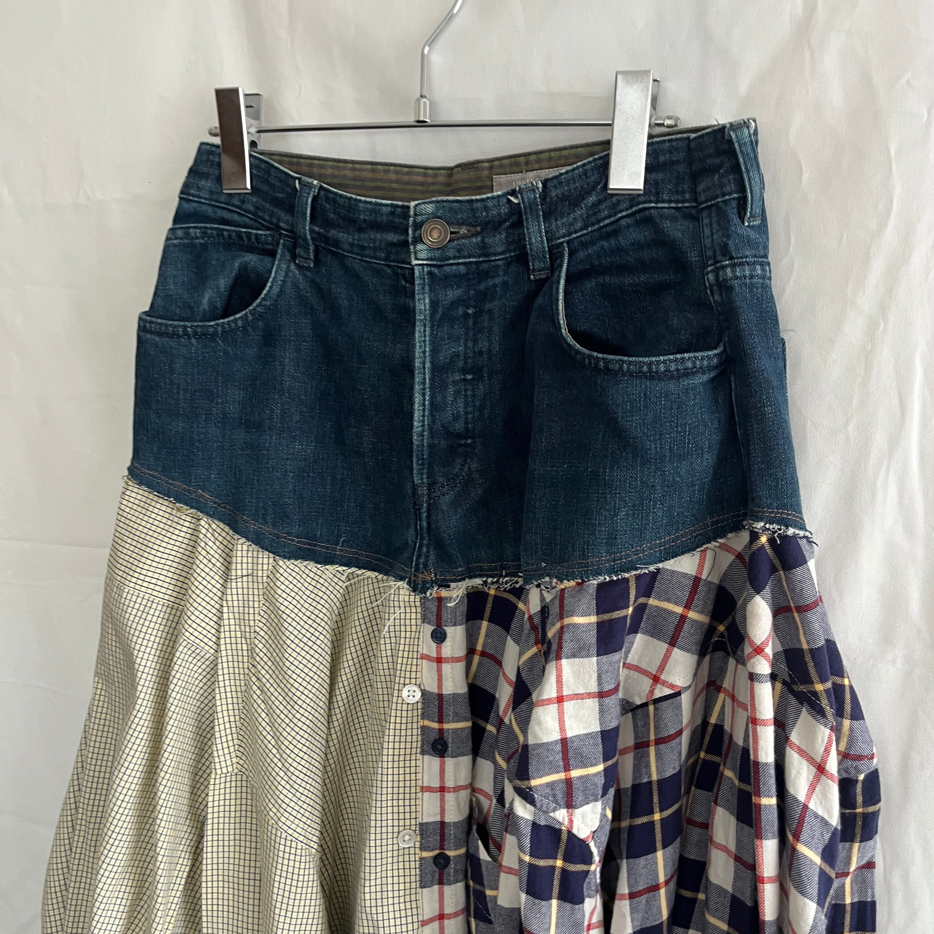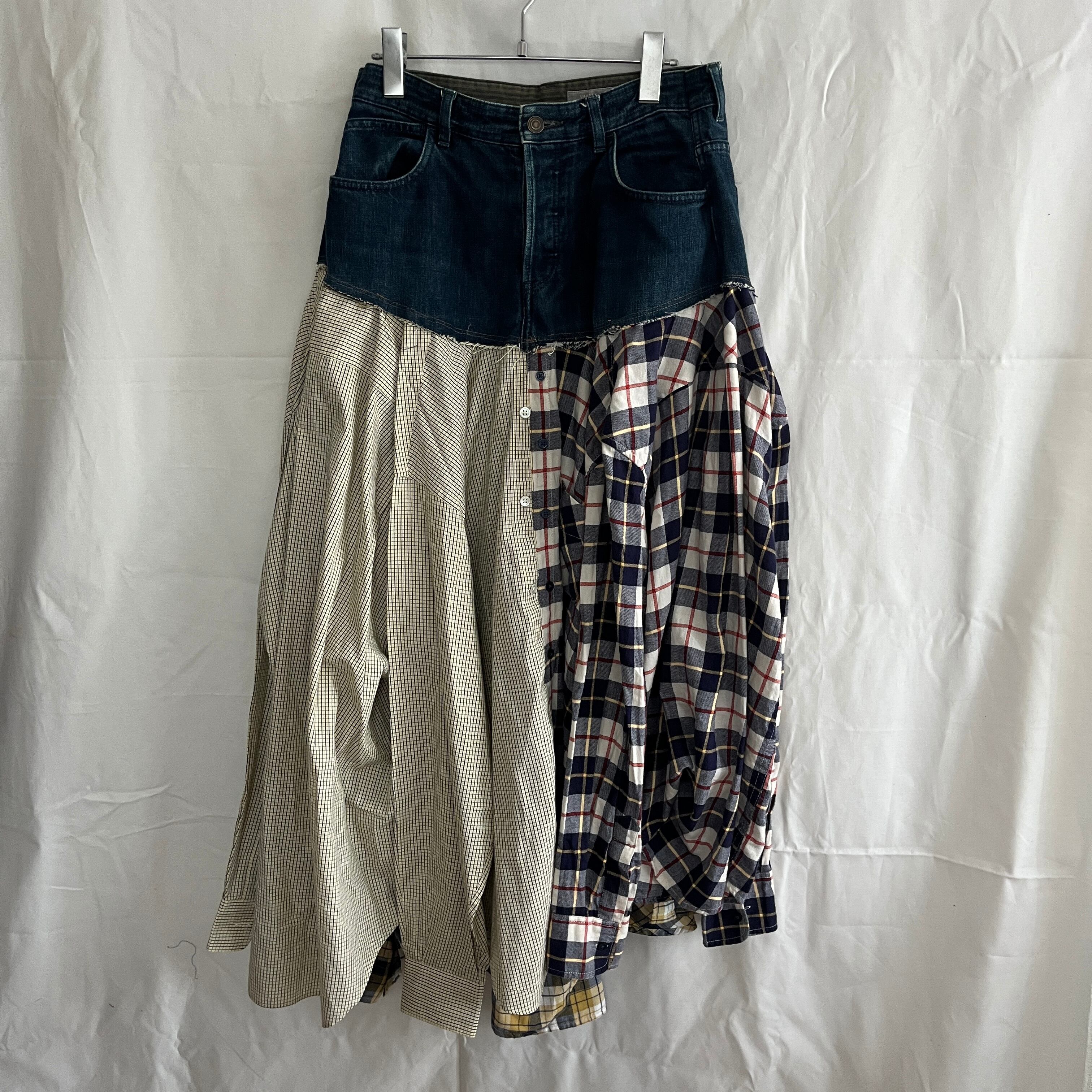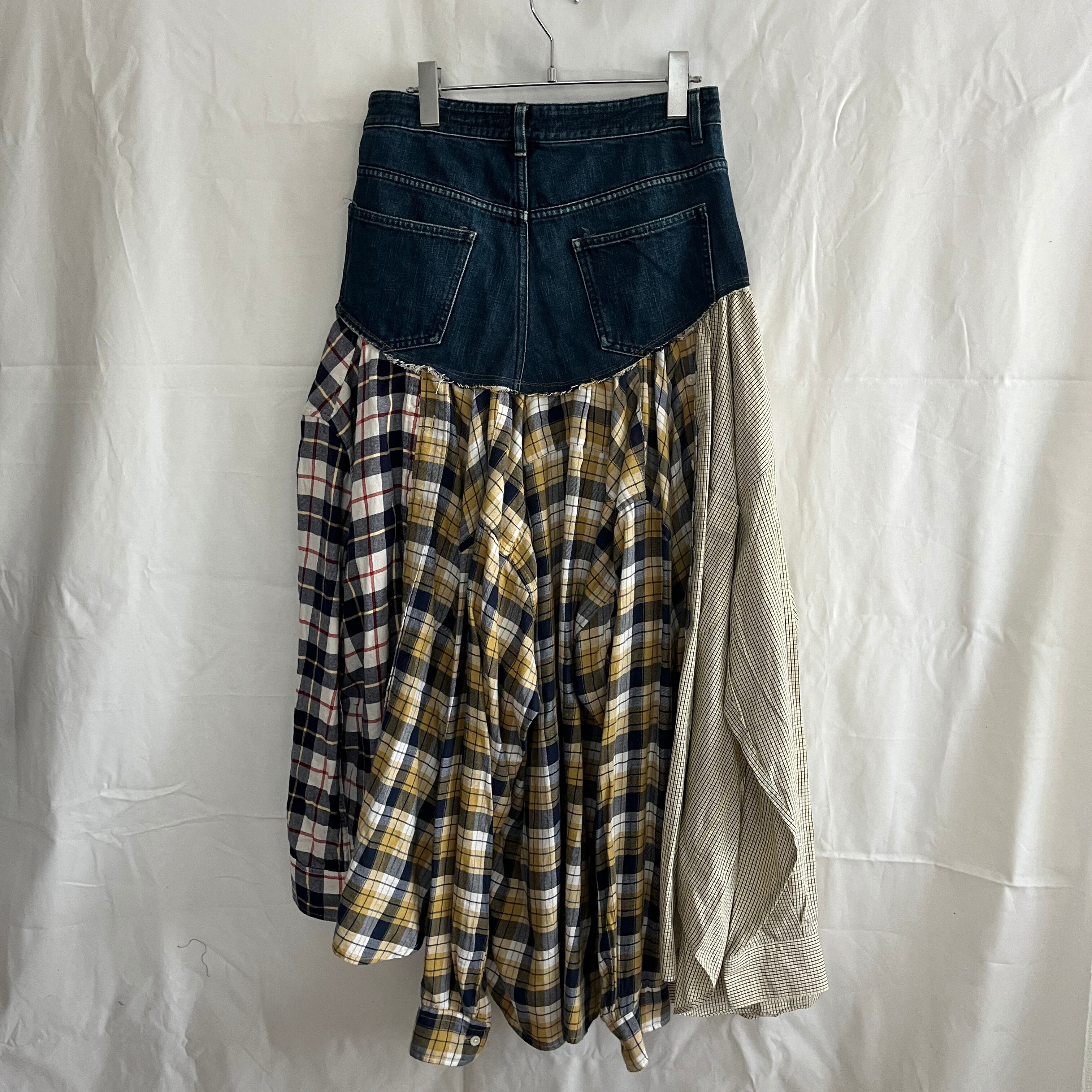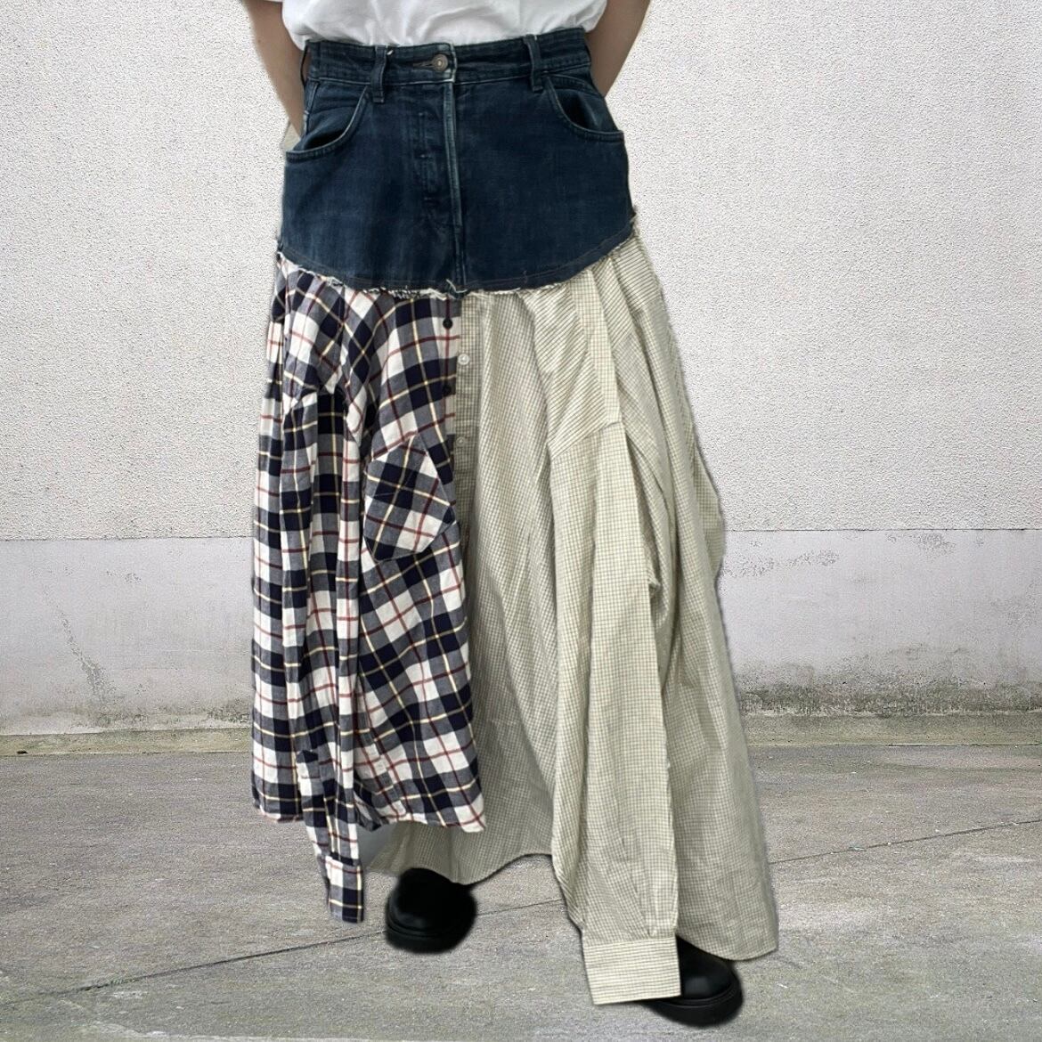 3枚のワイシャツを組み合わせ、デニムとドッキングしたフレアスカート。
