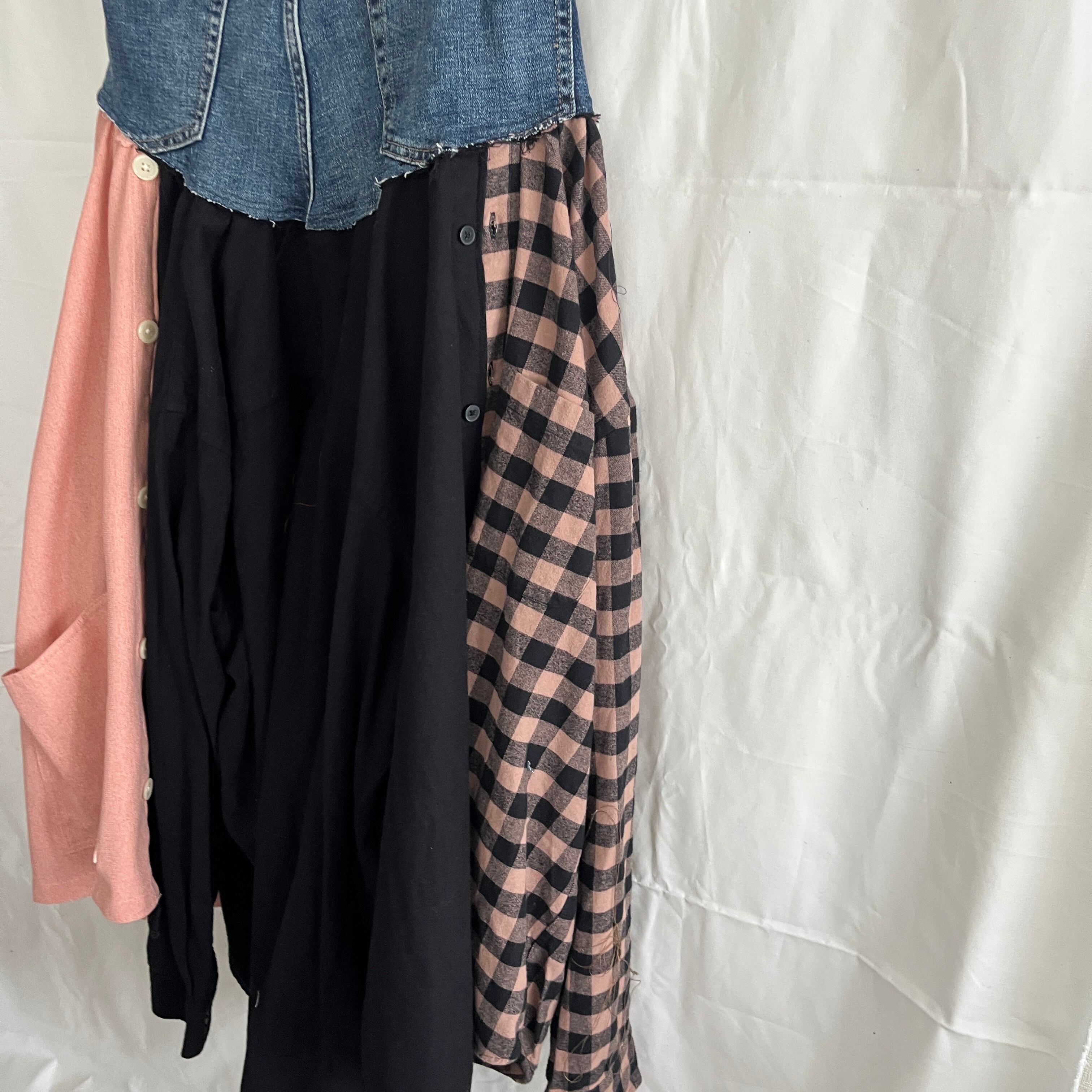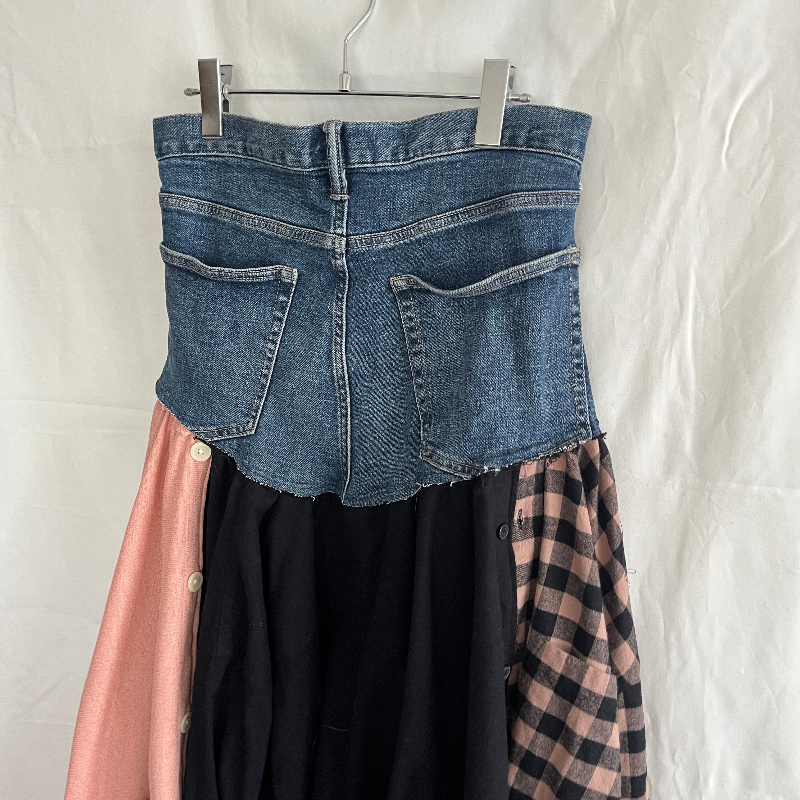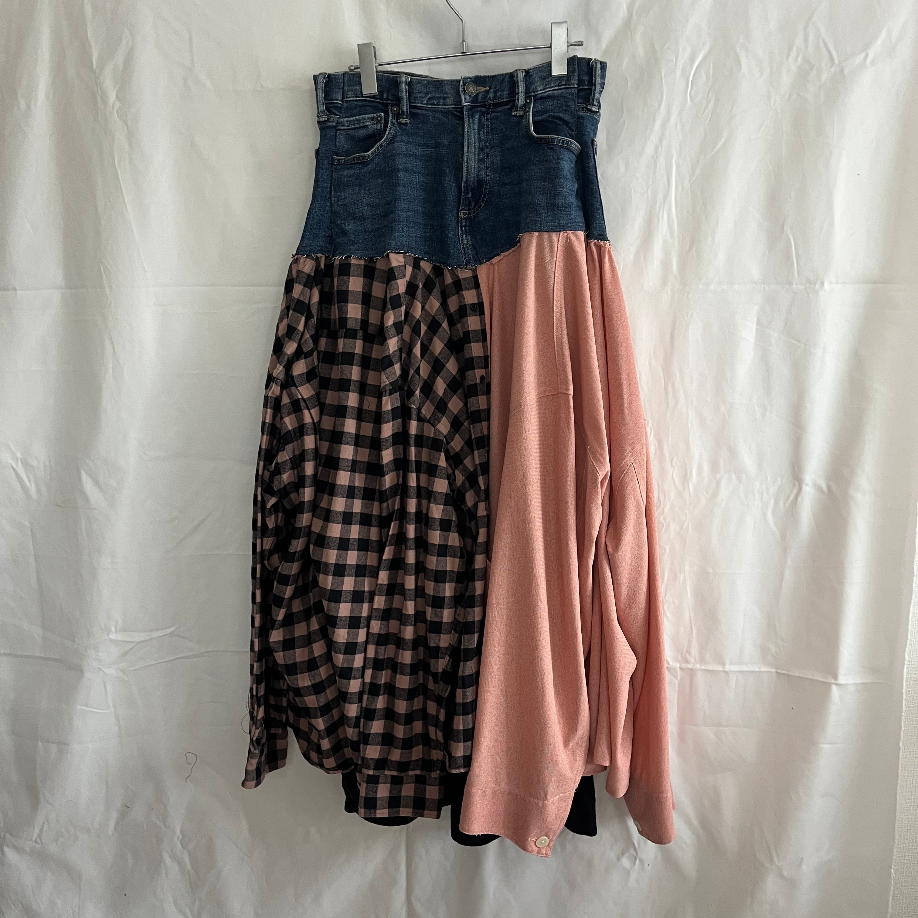 3枚のワイシャツを組み合わせ、デニムとドッキングしたフレアスカート。