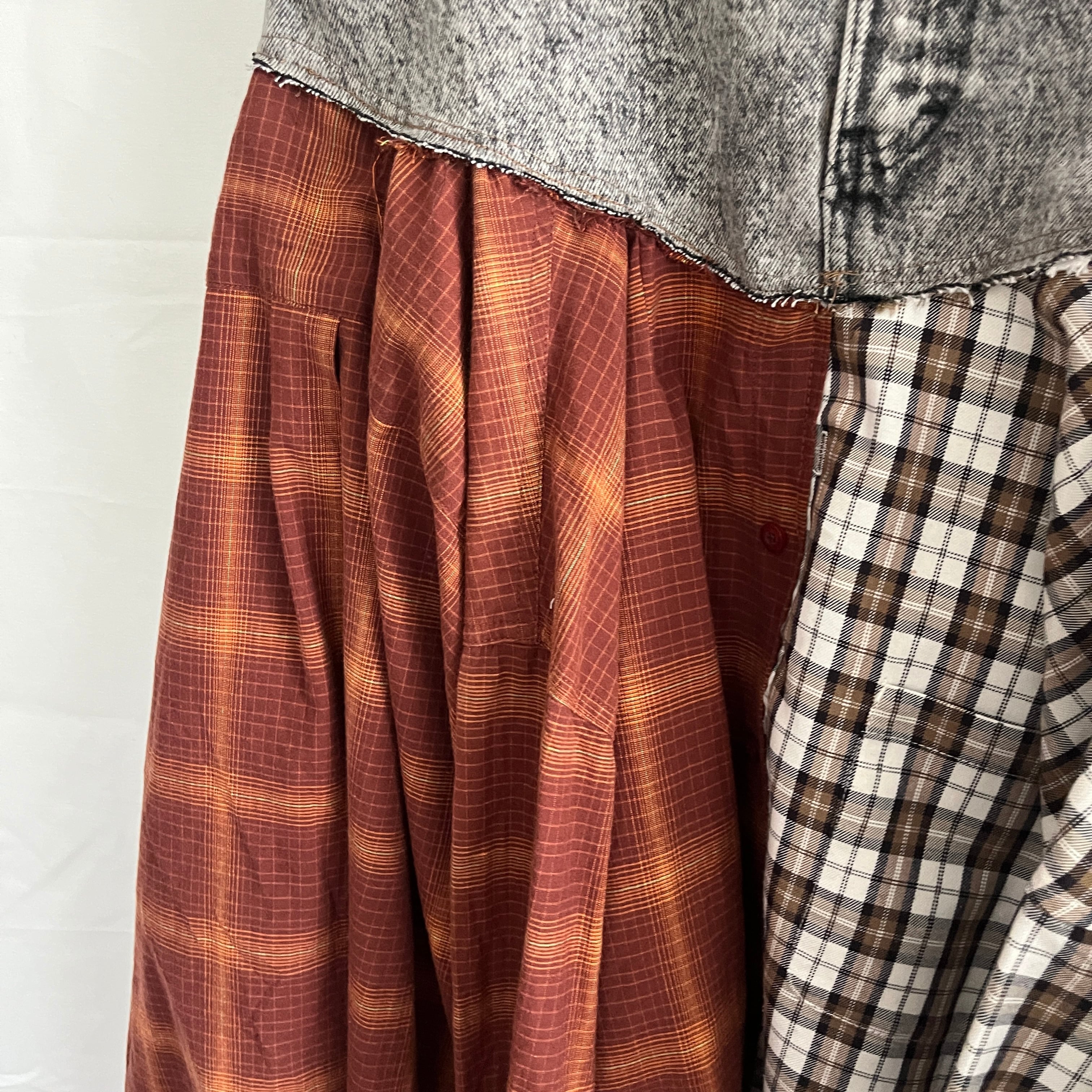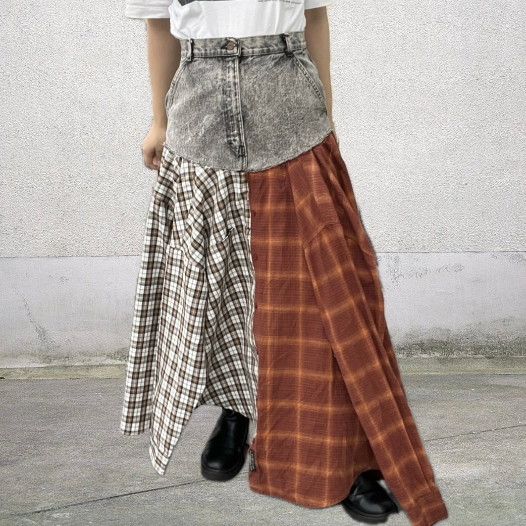 3枚のワイシャツを組み合わせ、デニムとドッキングしたフレアスカート。