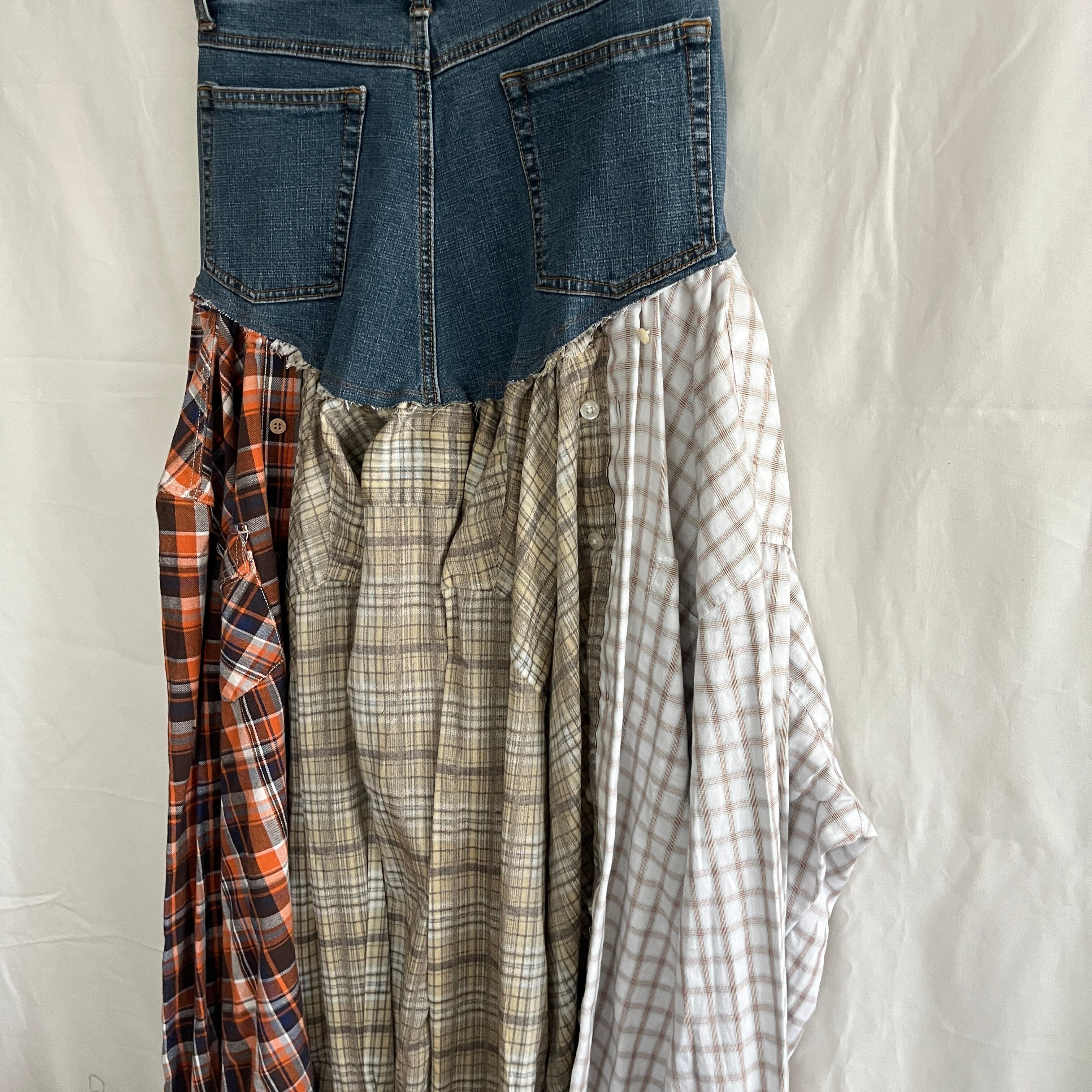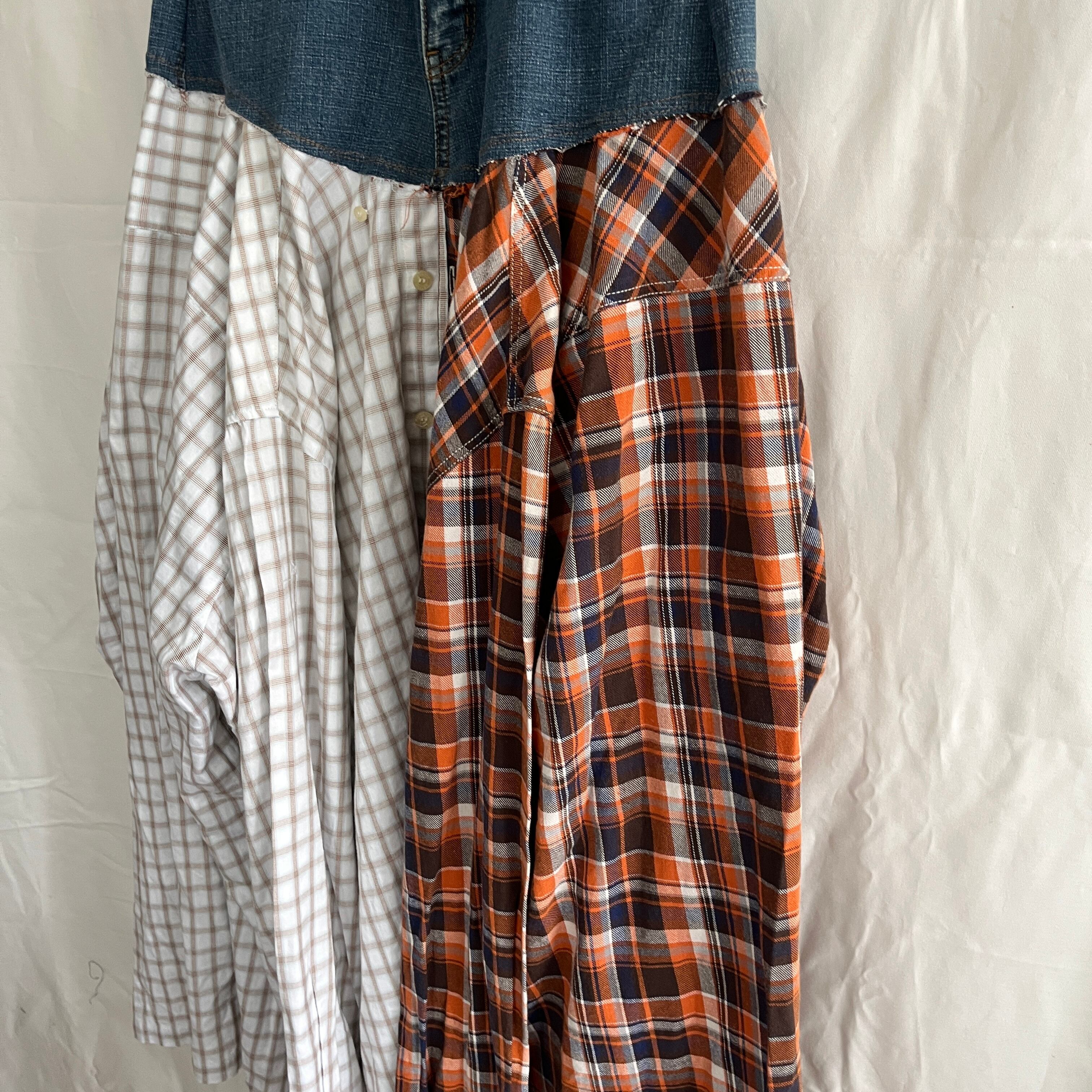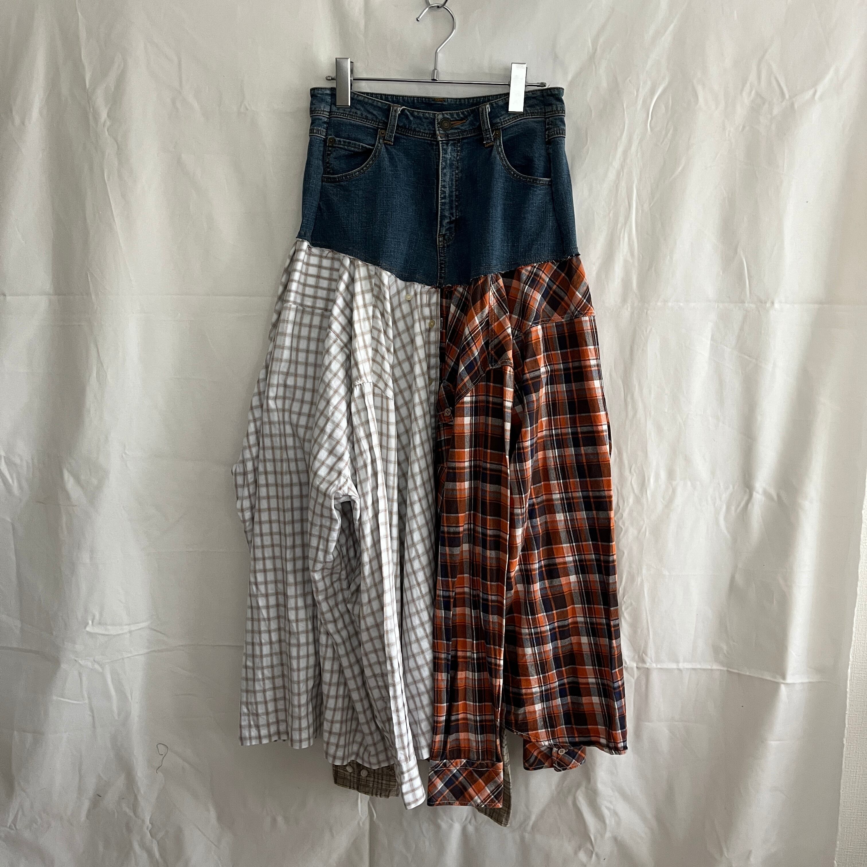 3枚のワイシャツを組み合わせ、デニムとドッキングしたフレアスカート。