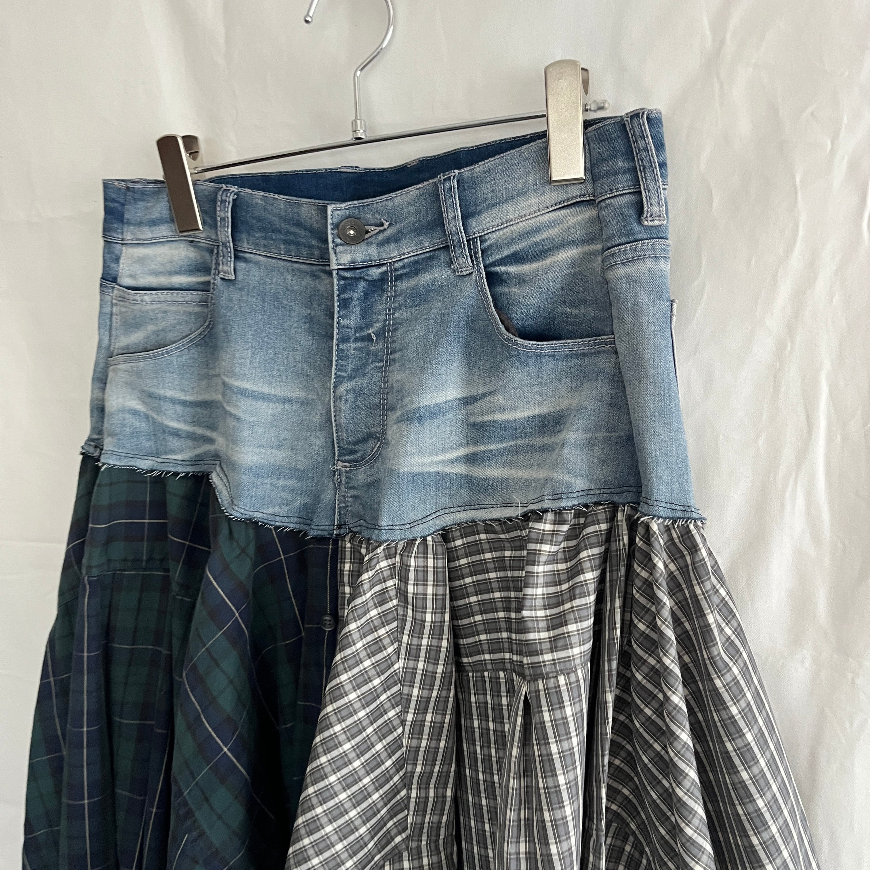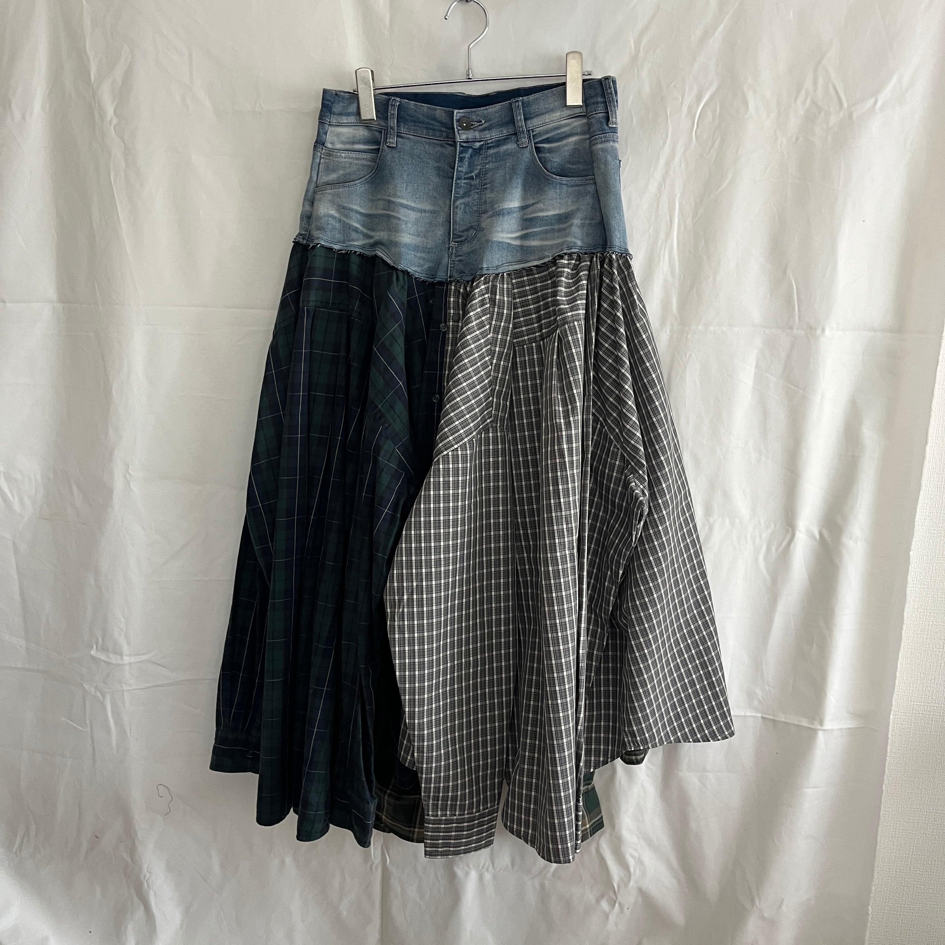 3枚のワイシャツを組み合わせ、デニムとドッキングしたフレアスカート。